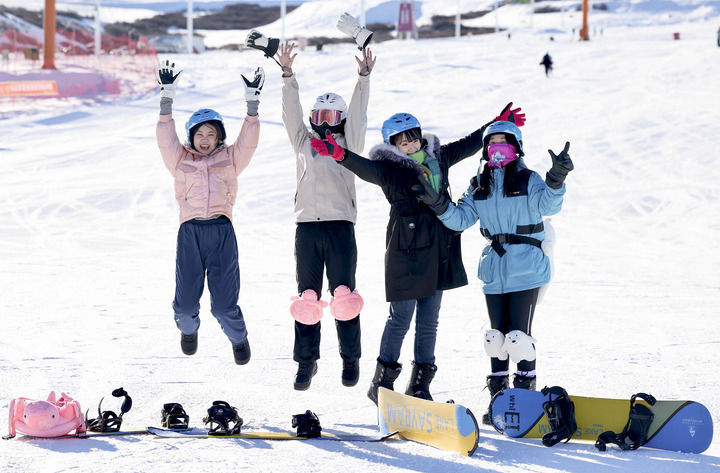 2025年1月27日,几名滑雪爱好者在新疆丝绸之路山地度假区合影留念。新华社记者 王菲 摄