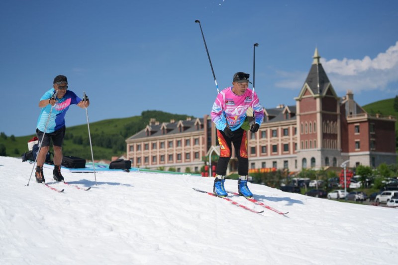 7月11日,两名滑雪爱好者在内蒙古牙克石市凤凰山景区的雪道滑雪。当日,内蒙古呼伦贝尔市牙克石市凤凰山景区启幕雪夏欢乐季活动。当地利用去年冬季储存的积雪,在景区内铺就一条雪道,以季节反差为游客营造出独特的冰雪运动体验。新华社记者 马金瑞 摄