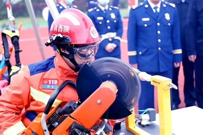 11月18日,西咸新区消防救援支队“用消防力量点亮民心灯塔”主题为民服务站创建活动,在沣西新城消防救援大队启动。图为消防战士展示精湛的切割救援技术。