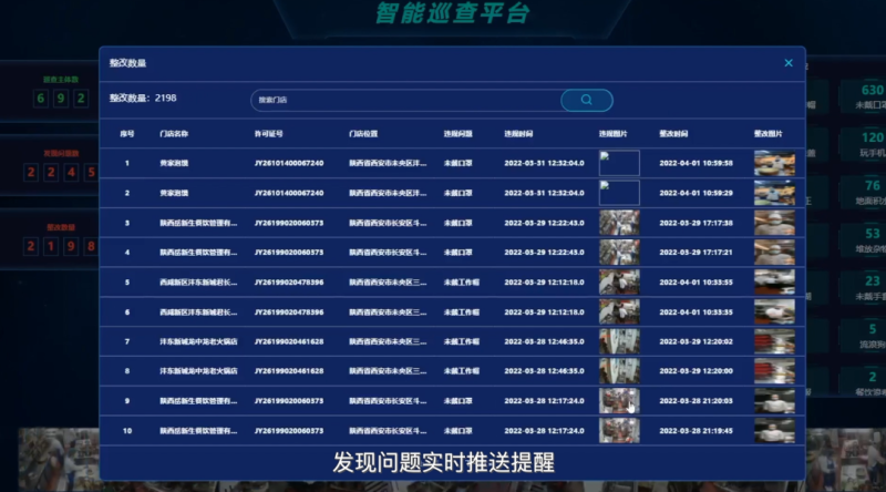 自检自查和专项检查任务也可通过阳光食安智慧监管平台发布,餐饮单位收到任务及时完成并拍摄上传,指挥中心专人审核反馈、实时监管,督促商家按时按要求完成自查整改。定人、定时、定点、定事、定景五定防伪技术的全面应用,堵住了数据造假的漏洞,确保了食品安全检查和违规整改的真实有效性。