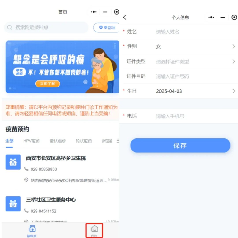 (2)进入小程序后,点击“我的”,进行个人信息完善。