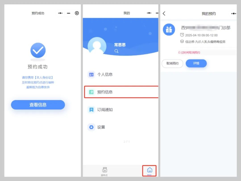 (4)页面显示预约成功后,可在“我的”页面点击“预约信息”查看详细信息。