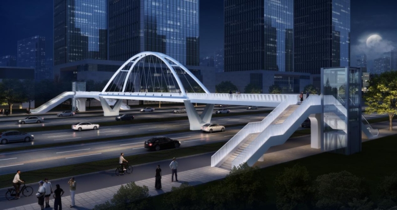 “翼翼飞鸾”,该方案源自诗句:“翼翼飞鸾,载飞载东”,以飞鸟之姿演化创作,抽象成三角拱、V形塔的组合形式,天桥外观简单大气,充满灵动之美。天桥主体采用三角钢拱结构,并在主桥两侧加装升降直梯及自动扶梯,桥梁整体采用淡雅的白色调涂料,铺装图案为浅灰+明黄的菱形纹样与桥梁结构呼应,栏杆采用简洁的横条纹白色栏杆。