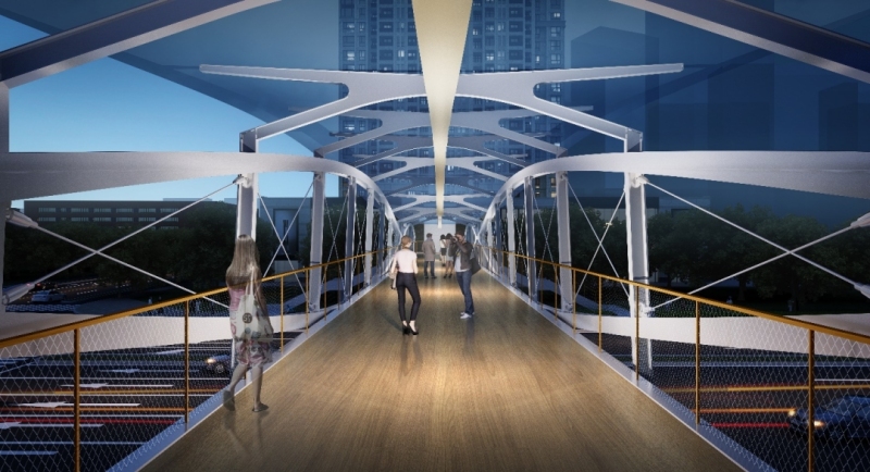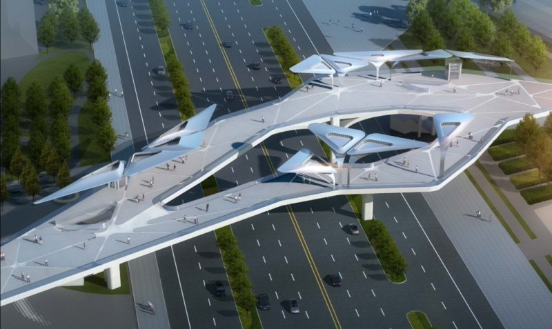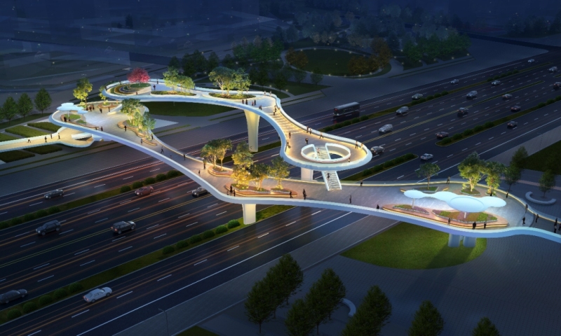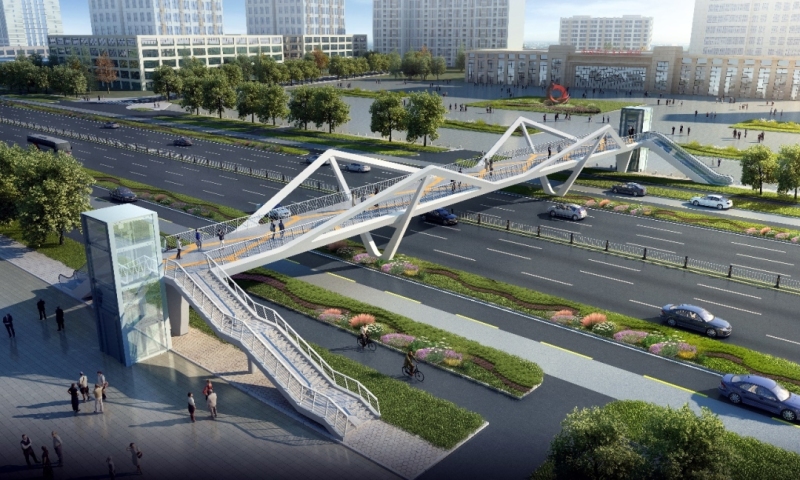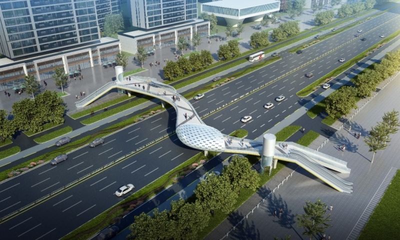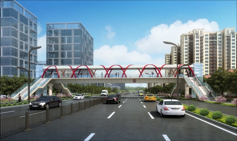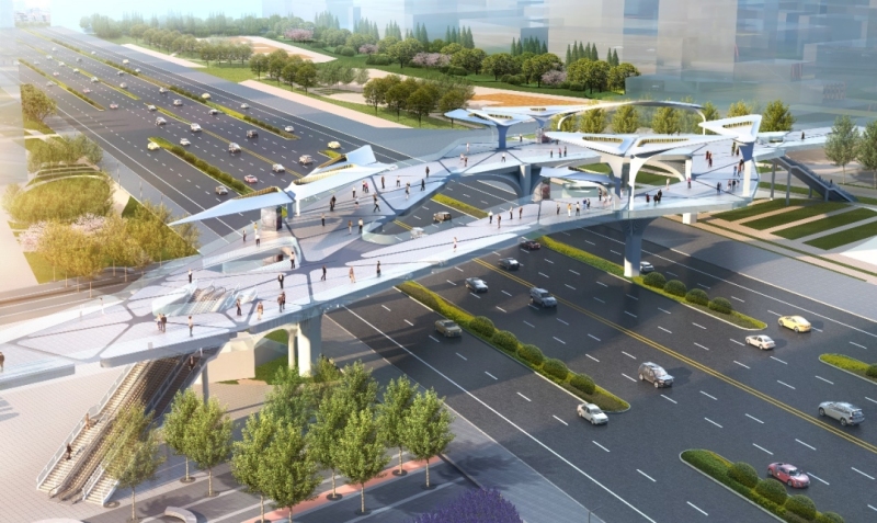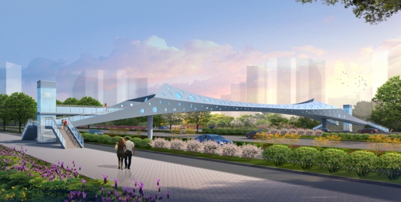 “星际之桥”,取意于具有科技创意感的星际飞船,将科技与创意巧妙融入桥梁设计,整个结构自然、和谐。天桥主桥采用钢箱梁,桥面铺装采用天然石材铺装,天桥两端各设1部无障碍电梯。
