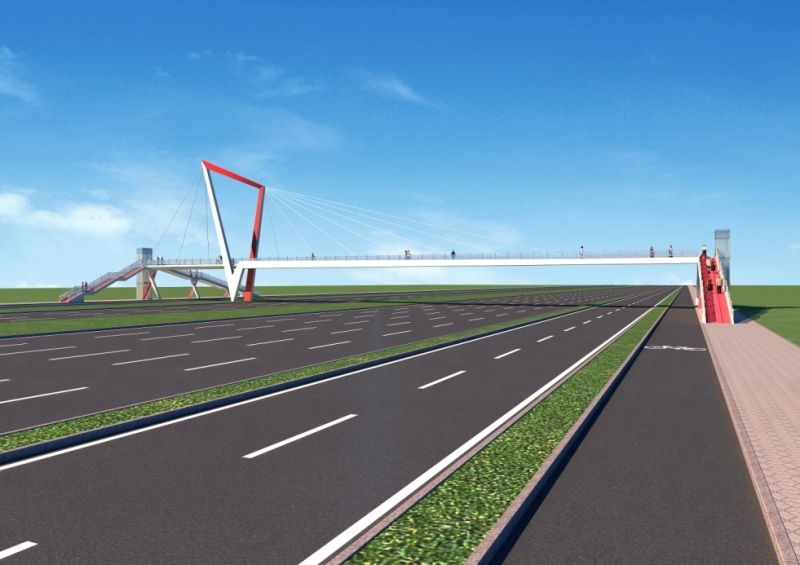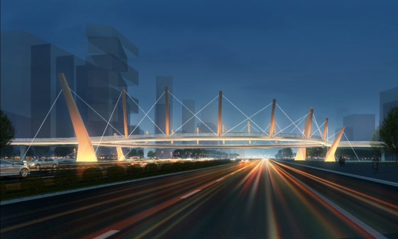 “科技之光”,从科技和经济发展的折线立意,抽象出一条充满科技感、空间力学感的折线,形成天桥主体结构,体现了科学与发展的主题。天桥主桥采用单塔斜拉桥,全桥主体结构均采用钢结构,东西侧各设升降直梯1部。