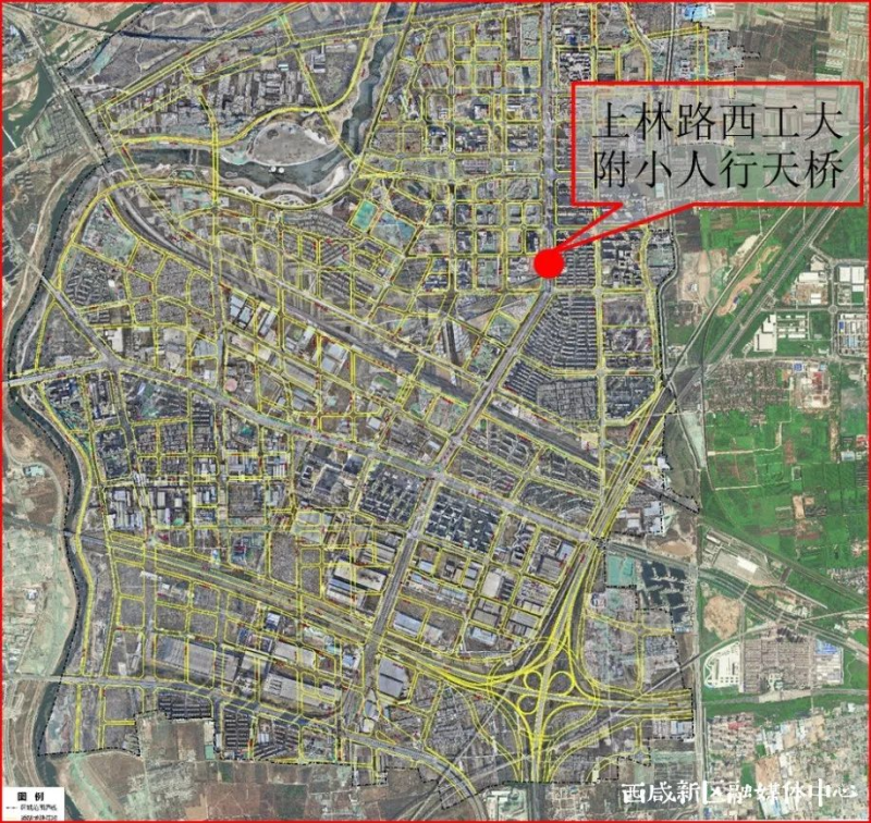 该桥梁位于上林路和丰登路交汇处,该天桥周边以学校、居住及商业用地为主,服务于西工大附小及周边居住区的过街通行,建成后将有效缓解上林路高峰期道路拥堵问题。