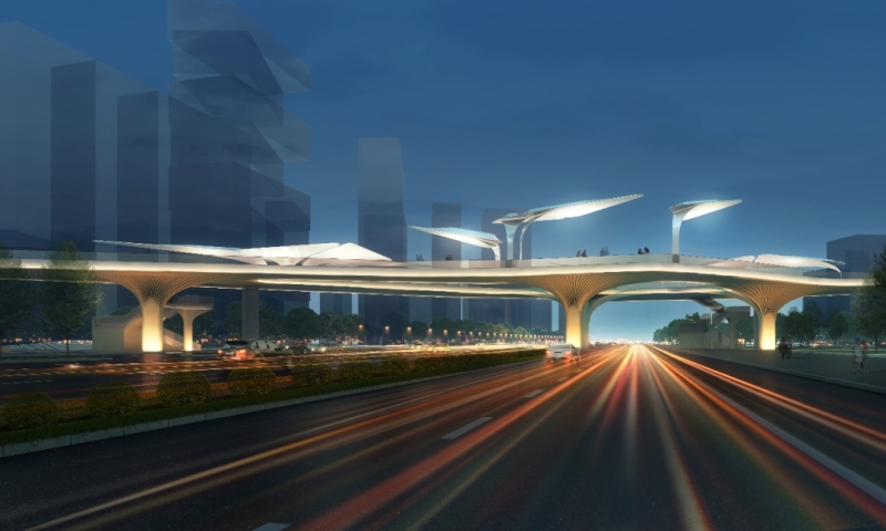 “金声玉润”,设计步行道蜿蜒穿行,体现玉润之形,立柱造型如音乐旋律,用顺畅优美的结构变化,展现规律与韵律,体现金声之美;取金声玉润之意,表达文章气韵优美。天桥主体结构采用芬克式结构,呈环形布置,主桥塔、桥墩以及无障碍电梯呈三角面造型,与立面结构呼应,形成整体清爽干练的造型,天桥整体跨越世纪大道(东段)。