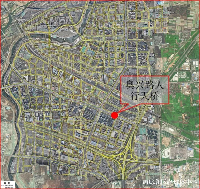 该桥梁位于西咸新区中央轴线与世纪大道(东段)交汇处,属于世纪大道(东段)跨街天桥,南侧为国润城中心绿地,方便周边行人通行。