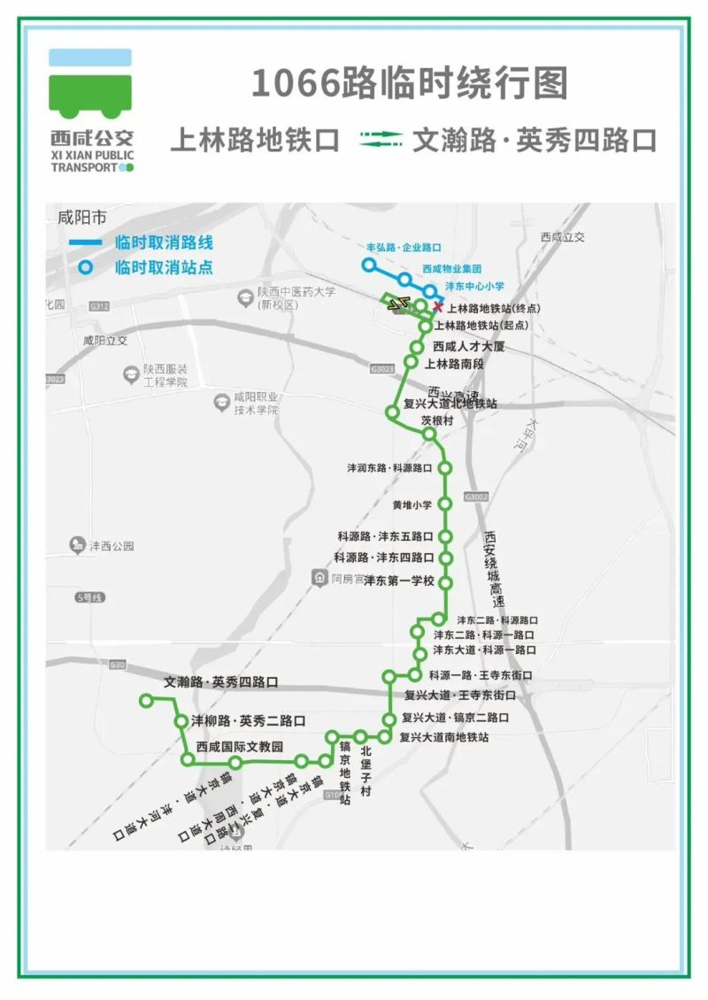 因丰弘路道路围挡拓宽,车辆无法正常通行,近日,西咸公交集团对1066路进行临时绕行运营调整,具体如下。