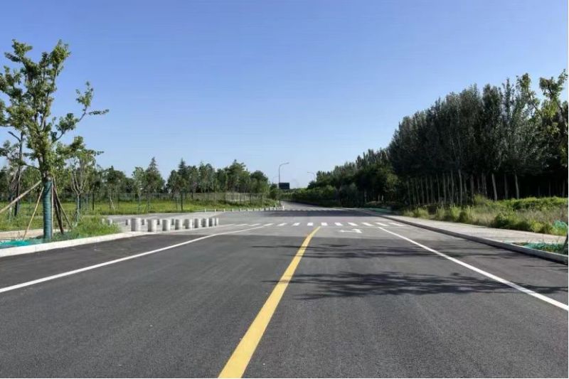 目前,已完成主车道铺油及道路标线施工,路缘石安装及人行道铺装全部完成,正在进行路灯安装。