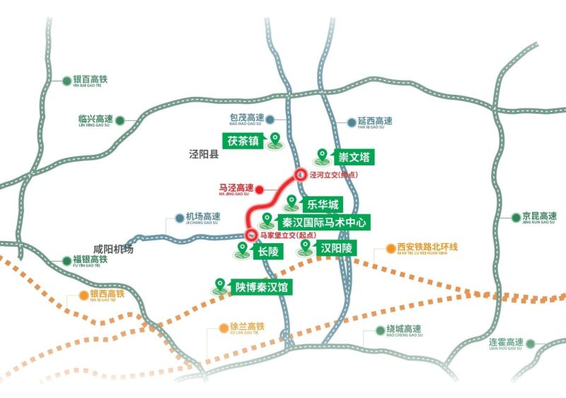 马泾高速由陕西交控集团负责建设,作为陕西省省级公路网规划的重要联络线,连接了机场高速与G65包茂高速公路。项目起点位于机场专用高速马家堡立交,终点位于包茂高速泾河新城立交。路线全长8.3公里,按双向六车道高速公路标准设计,路基宽度33.2米,设计速度100公里/小时,沿线主要经过西咸新区秦汉新城、泾河新城。