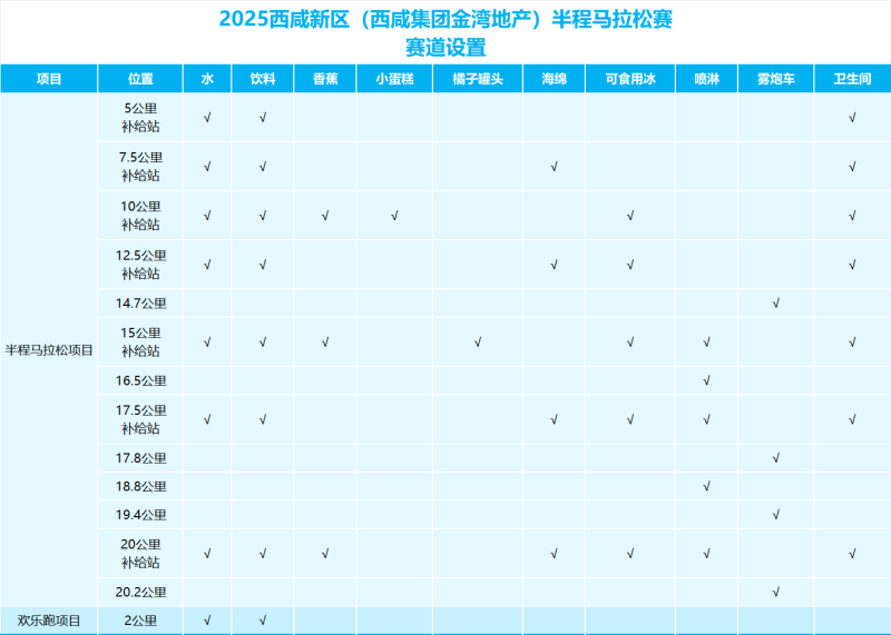 1.赛道沿途共设有5处喷淋点,分布在赛道15km、16.5km、17.5km、18.8km、20km 处,保障选手降温。