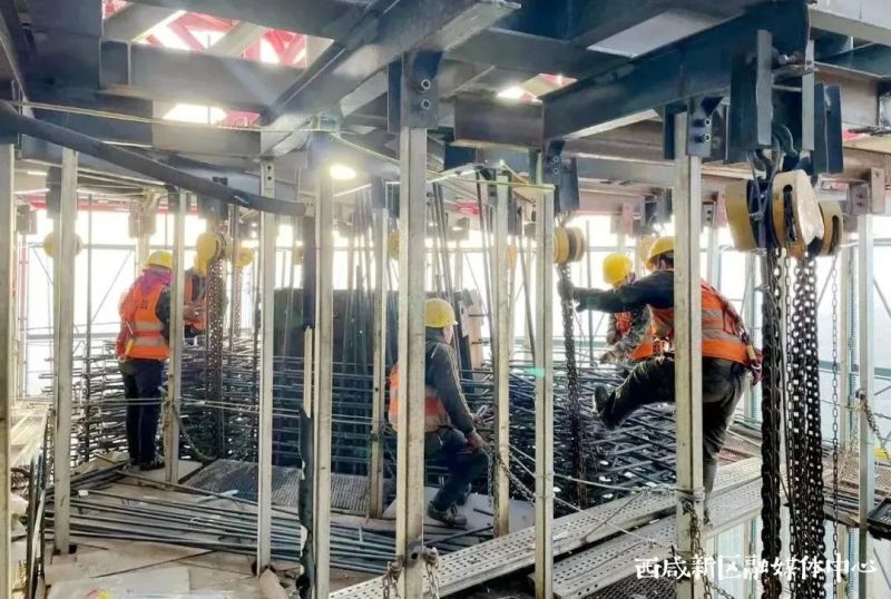 项目负责人介绍,根据计划节点和施工情况,项目部调整了“造楼机”的爬升规划,有序穿插各项工序,对内外墙一次支模两次浇筑,多举措确保项目的顺利推进。