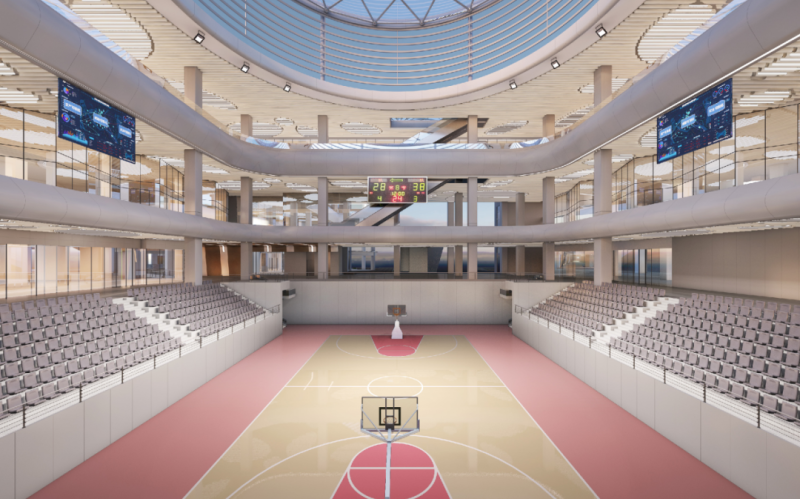 泾河新城体育中心共五层。地下一层为下沉式篮球场,可同时容纳1200人观赛。负一层围绕场地四周设有运动员和裁判签到、更衣、休息、研判、会议组团空间,也为赛事组织委员会和新闻媒体预留了后勤、办公、会议等组织用房。