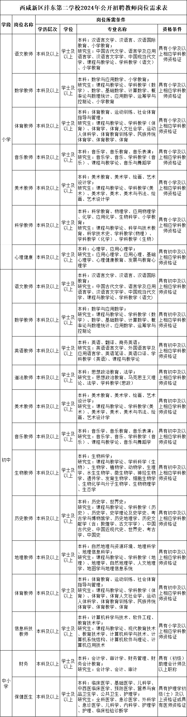 《西咸新区沣东第二学校2024年公开招聘教师岗位需求表》
