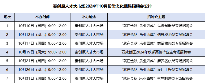 10月份,秦创原人才大市场将举办7场不同主题类型现场招聘会,满足各企事业单位和广大求职者双选需求。具体安排如下。