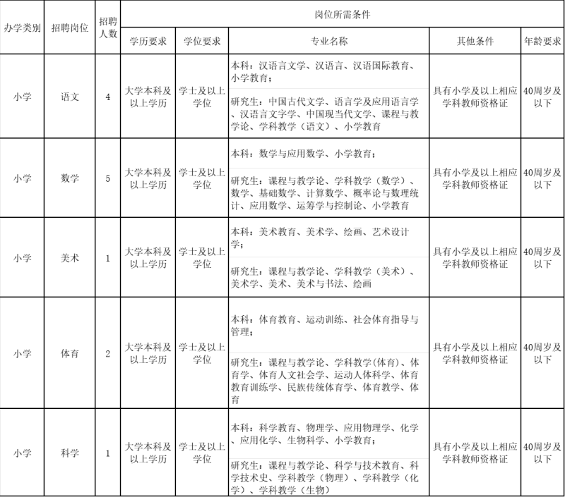 小学教师计划招聘3名。其中:小学语文2人,小学数学1人。