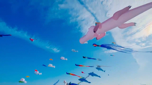 巨大的八爪鱼、海螃蟹、蓝鲸、可爱的鱼群……“海洋生物”齐聚蓝天展露可爱身姿,与春景相得益彰。