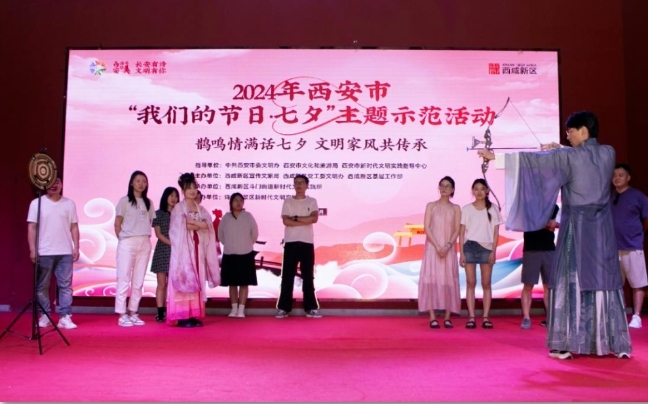 8月8日,“鹊鸣情满话七夕 文明家风共传承”——2024年西安市“我们的节日·七夕”主题示范活动在西咸新区诗经里景区举办。