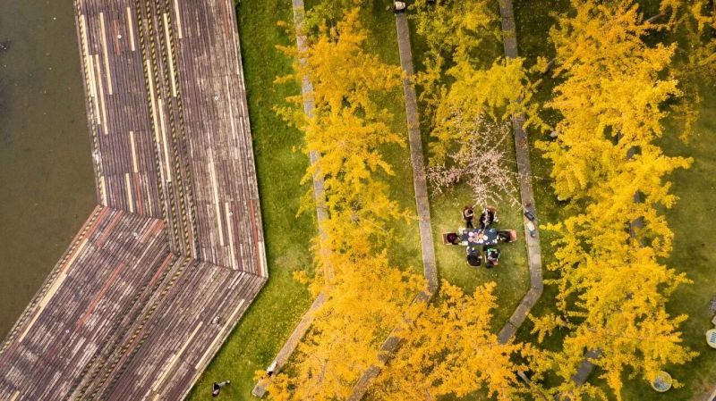 初冬的公园树木色彩斑斓,镐京桥旁的开阔草地是露营绝佳地,支起天幕、煮茶赏景,既能看河水淙淙、芦苇摇曳又能偶遇河面嬉戏的水鸟,尽享慢节奏的休闲时光。