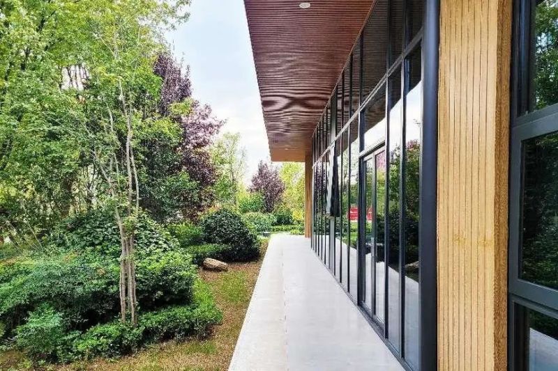 交大创新港科创板块两侧,自临渭路到学镇环路,花园步道,林木葱茏,湖水潋滟,曲径通幽从东向西共有4座绿楔。