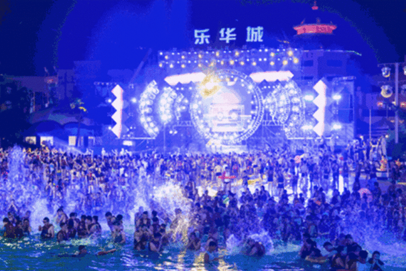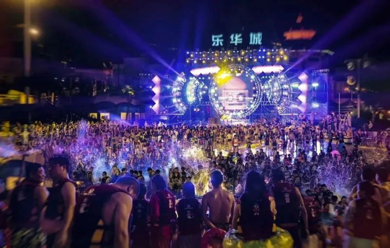 在国家AAA级景区乐华城•88℃温泉乐园里,当灯光点亮音乐响起,景区秒变大型水上蹦迪现场。舞台上演员尽情表演,唱歌、热舞、魔术,造浪池内水声与欢叫声一波接着一波。