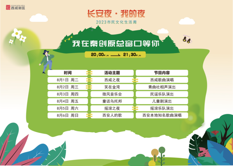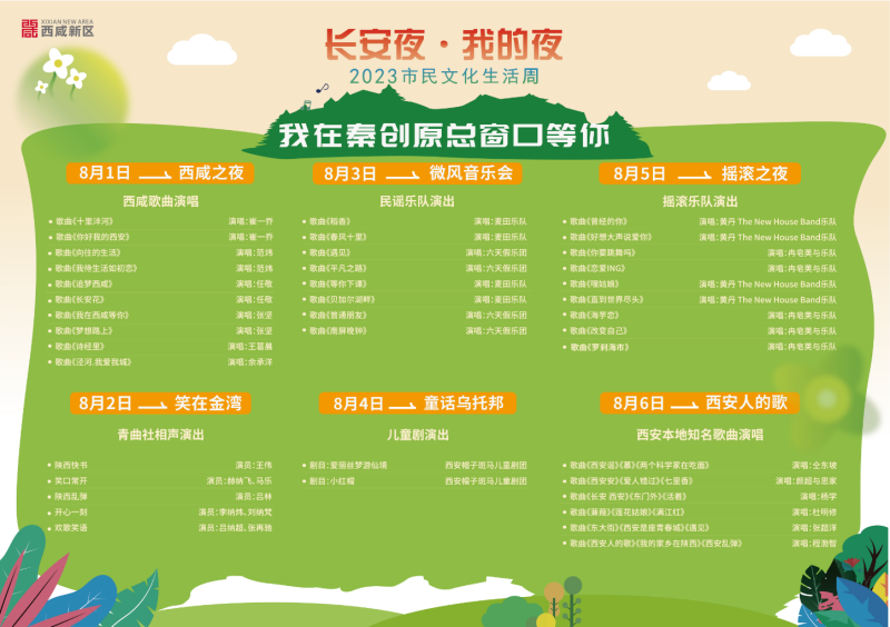 此次活动由西咸新区管委会主办,新区宣传文旅局、能源金贸区园办承办,旨在活跃群众夜间文化生活,打造新的夜游消费场景,更好地满足人民日益增长的美好生活需要。活动期间将推出主题演出、创想夜巷、亲子互动科趣体验等七大类活动,其中,每晚20:00-21:30推出的“长安夜·我的夜”主题演出活动,将为大家呈现西咸之夜的别样精彩。