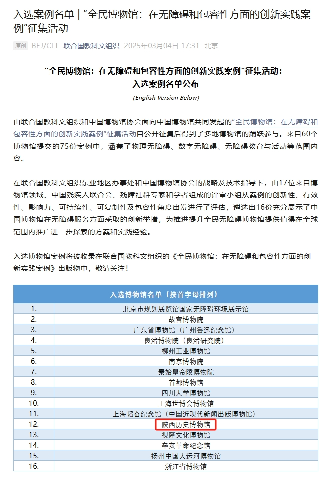 2025年3月4日,联合国教科文组织官方微信公众号公布了“全民博物馆:在无障碍和包容性方面的创新实践案例”征集活动的入选案例名单,陕西历史博物馆无障碍服务案例入选其中,将被收录于联合国教科文组织的《全民博物馆:在无障碍和包容性方面的创新实践案例》出版物中。