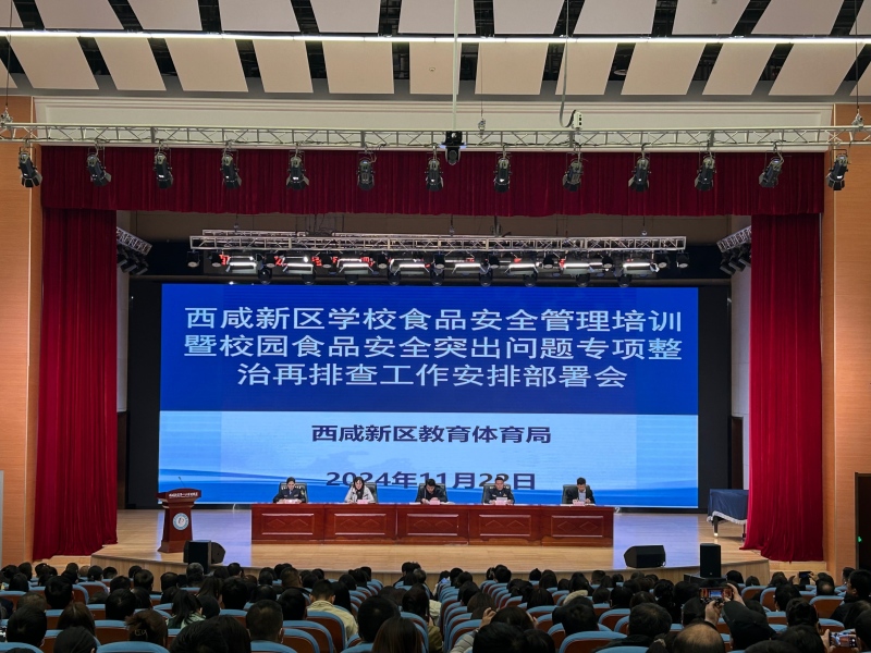 2024年11月22日下午,西咸新区教育体育局组织召开全区学校食品安全管理培训暨校园食品安全突出问题专项整治再排查工作安排部署会。新区教育体育局党委委员、副局长刘国阵、新区市场监管局沣东分局四级调研员吉杰及专家朱少华老师出席会议。辖区各新城工作部食品安全负责人员和各中小学、幼儿园、中职学校、补习机构食品安全总监、食品安全员共计近800人参加会议。