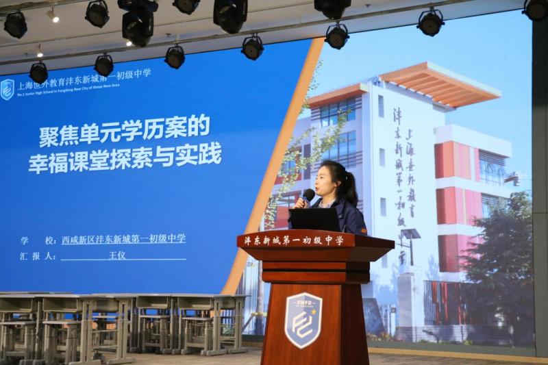 分享学校经验,创新课堂样态。沣东第一初级中学教学管理中心副主任王仪作了《基于单元学历案的幸福课堂探索与实践》主题报告,融合“135师生幸福课堂”和大单元教学理念的探索与实践,打造具有沣东一中特色的课堂教学新样态。
