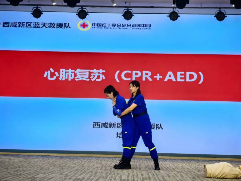 在活动现场,西咸蓝天救援队培训老师通过生动讲解和实际操作演示,向师生们传授了各种应急救援和避险知识,重点针对心肺复苏、AED使用、海姆立克等急救方法和绳结打法进行了讲解。