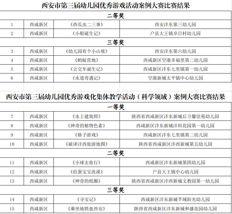在优秀游戏活动案例中,西安沣东第三幼儿园等6所幼儿园荣获二等奖2个、三等奖4个;在游戏化集体教学活动(科学领域)案例中西咸新区沣东后卫馨佳苑幼儿园等9所幼儿园荣获一等奖4个、二等奖3个、三等奖2个。在西安市第三届幼儿园保育专业技能大赛中,西咸新区7名幼儿园教师分别荣获一等奖1名、二等奖2名、三等奖4名。