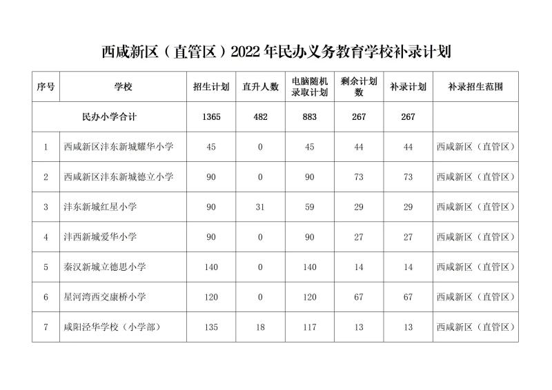 西咸新区(直管区)2022年民办义务教育学校补录计划