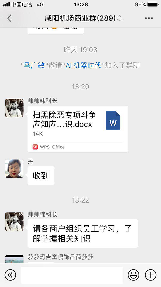 二、联合机场股份公司相关部门对辖区市场主体开展扫黑除恶宣传教育。一是通过每日在“机场商业群”微信群发送扫黑除恶专项斗争应知应会知识;二是利用机场商贸部对航站楼商户的月例会开展扫黑除恶专项斗争知识培训,从而加深市场经营主体对于扫黑除恶专项斗争工作的认识。