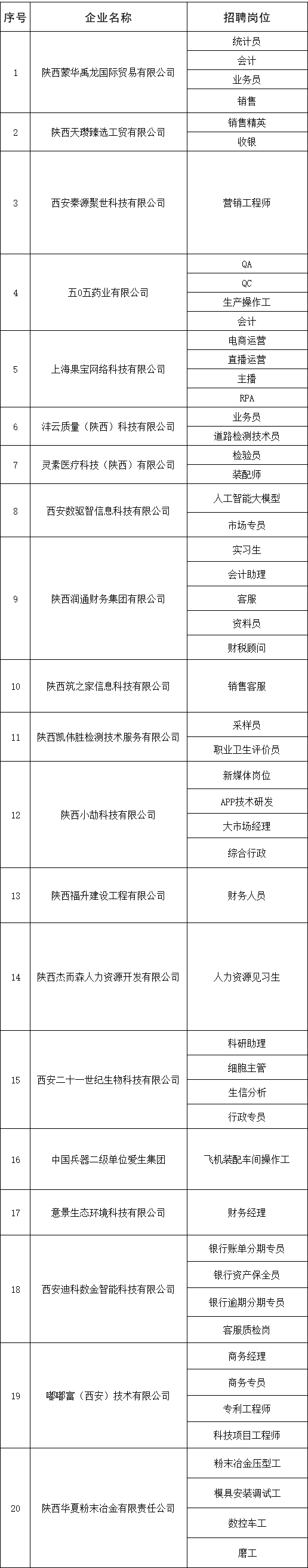 招聘企业及岗位名单