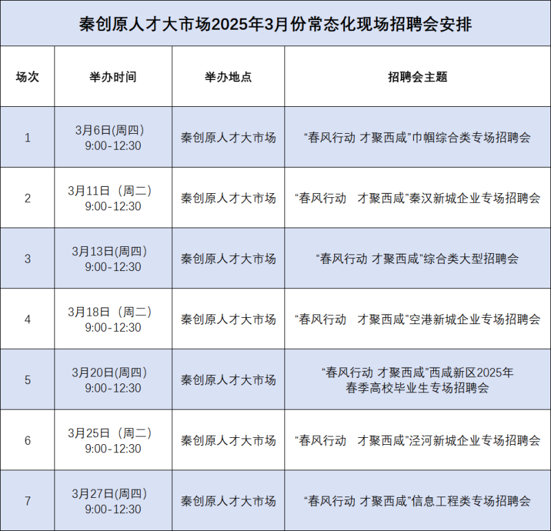 3月份,秦创原人才大市场还将举办多场不同主题类型现场招聘会,满足各企事业单位和广大求职者双选需求,具体场次如下。