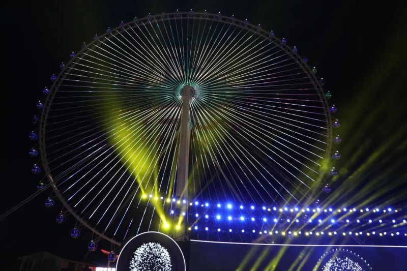 5、4、3、2、1……出席活动的领导和嘉宾们在现场的齐声倒数中按下按钮,西安欢乐海岸·OCT1314摩天轮正式启动炫彩夺目的光影秀随即点亮夜空。