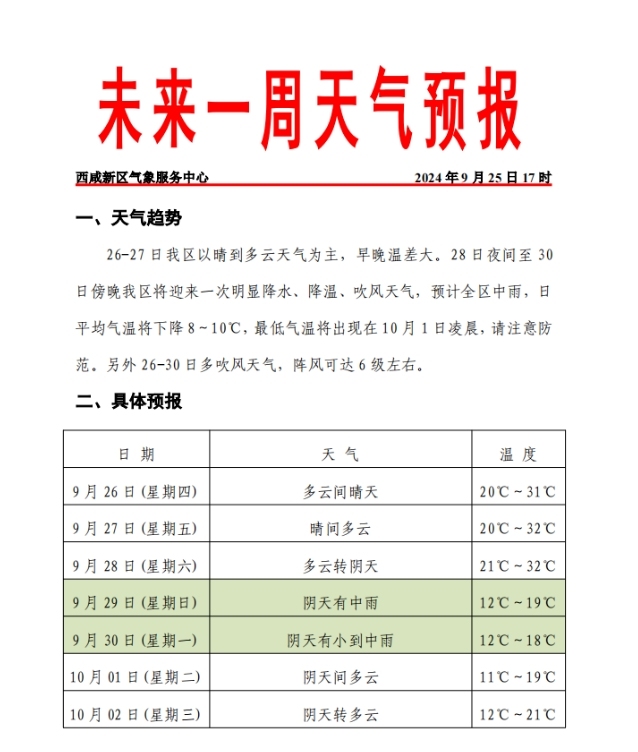 西咸新区气象服务中心2024年9月25日20时发布天气预报:受较强冷空气和高原槽共同影响,9月28-30日新区将出现一次明显降水、降温、大风天气过程,预计全区中雨,主要降水时段在29日。
