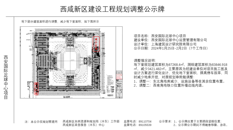 根据西安市自然资源和规划局《关于加强建设工程规划条件核实管理工作的通知》,现将西安国际足球中心项目规划许可内容调整予以公示。批前公示并非最终审批结果,在公示期内,利害关系人若有意见,可来电向西咸新区自然资源和规划局(沣东)工作部、西咸新区政务服务(沣东)中心反映。