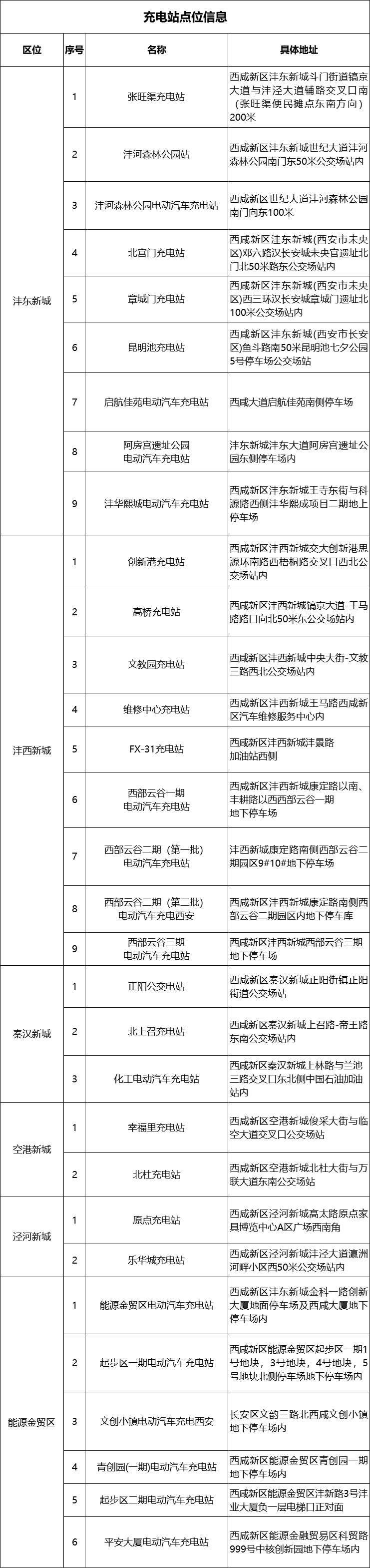 为满足群众就近充电需求,加快推动绿色交通出行,西咸公交集团加快在全区布局充电网络,为新能源车主们提供便捷的充电体验,目前已对外开放充电站点31处,详细如下。