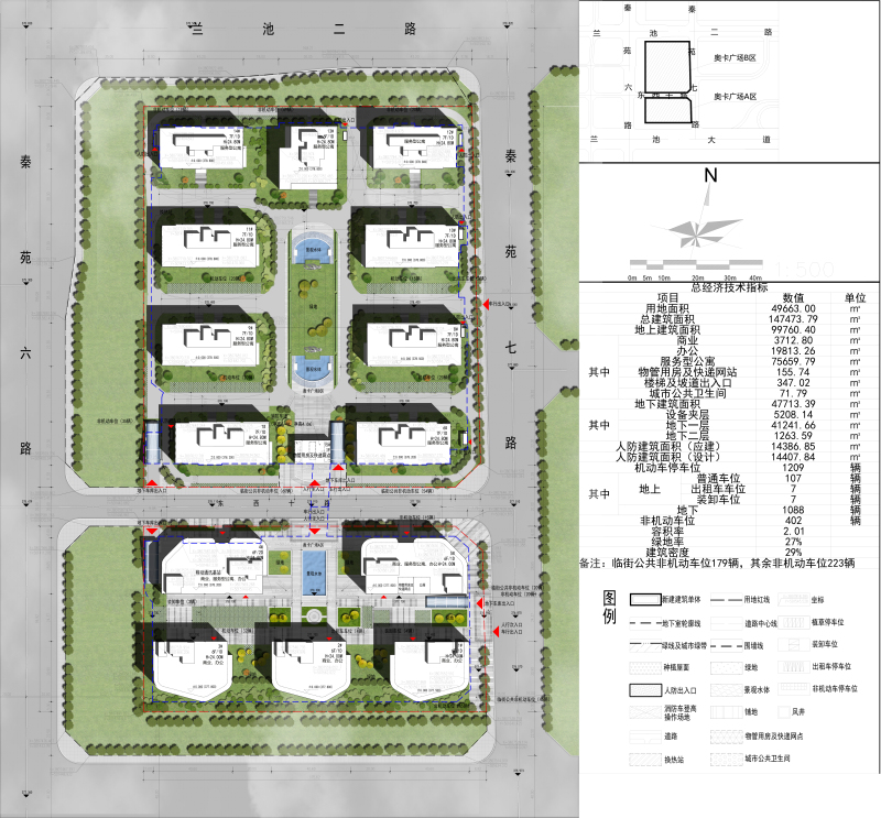 该项目设计方案经文物部门审查同意,项目位于西咸新区秦汉秦苑六路以东、兰池二路以南、秦苑七路以西、兰池大道以北区域。本项目规划净用地面积49663㎡,总建筑面积147473.79㎡,主要建设商业、办公及相关配套设施等。详见总平面示意图。